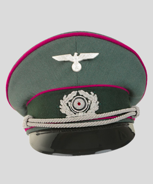 Premium quality historical reproduction visor cap crafted from field grey gabardine wool with detailed officer insignia and polished visor peak. Designed for collectors, reenactment, uniform displays, and costume use, this cap delivers authentic structure, traditional styling, and comfortable interior construction.
